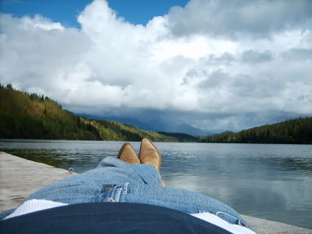 My dad's dock... on Long Lake, which is twenty miles south of McCarthy, Alaska. We laid there on the dock with Daisy (the dog)... until it got a bit late then we went into McCarthy.