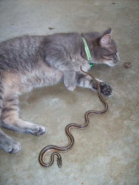 That's Bleu playing with a dying snake. By golly that cat was having fun. I thought about taking the snake away and trying to discern if it was poisonous, but... 1) Bleu was having too much fun 2) If the snake was going to bite him it would have been long before Bleu frazzled it's nervous system and 3) Bleu is an outdoor cat and knows what he's doing.